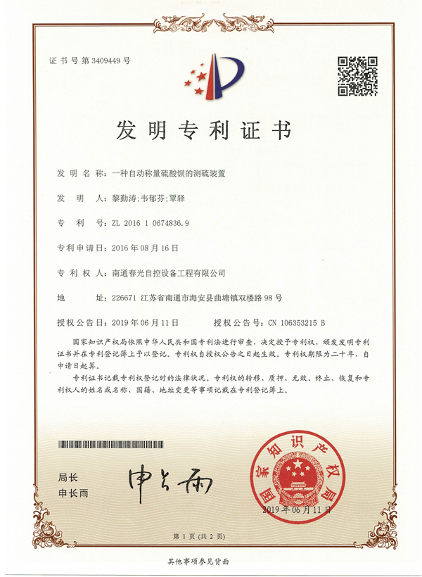一種自動稱量硫酸鋇的測硫裝置專利證書